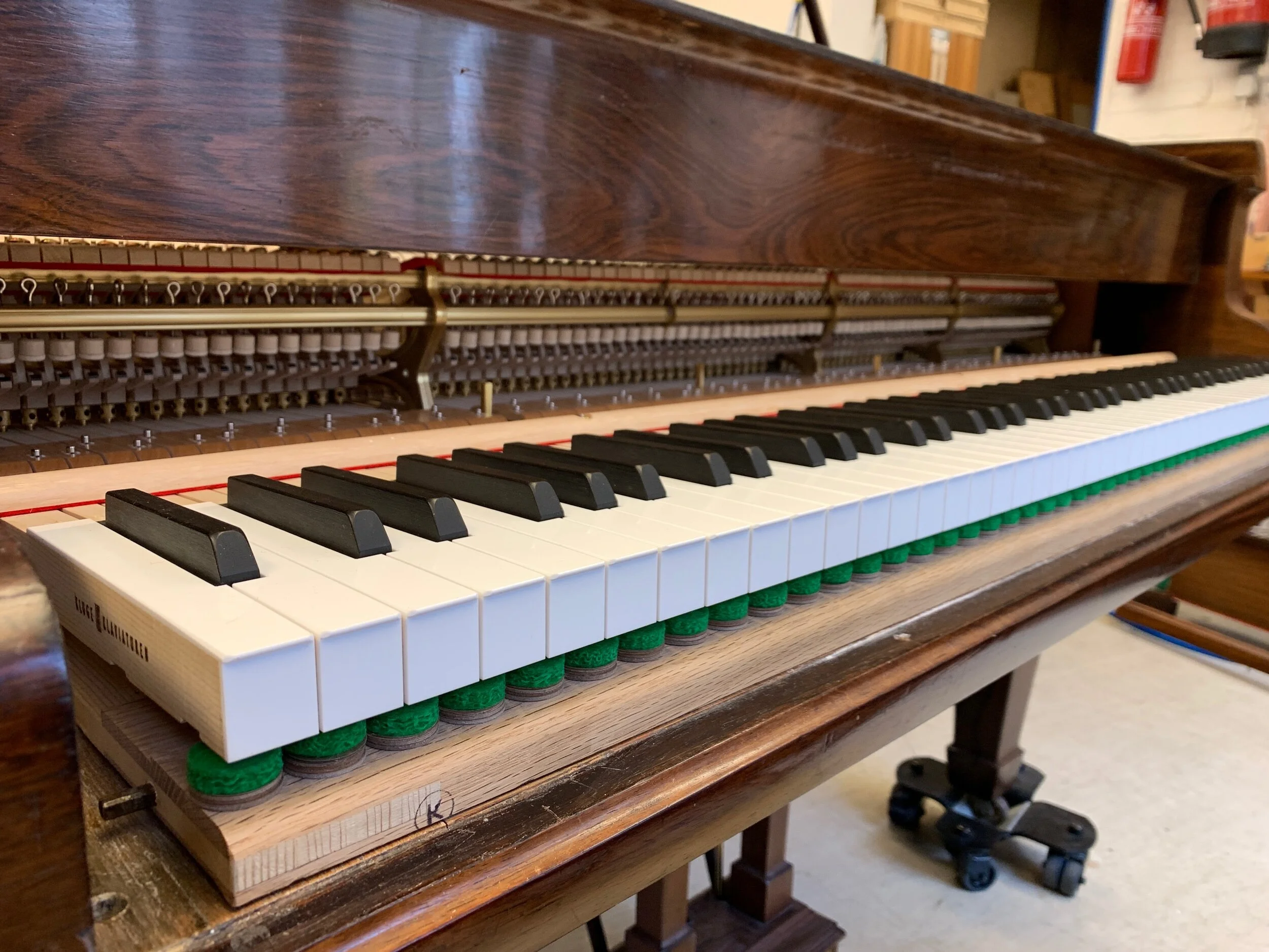A new ‘top action’ mechanism has been built up in the workshop and new hammers tailed, bored and glued on to the shanks to ensure a precise fit.