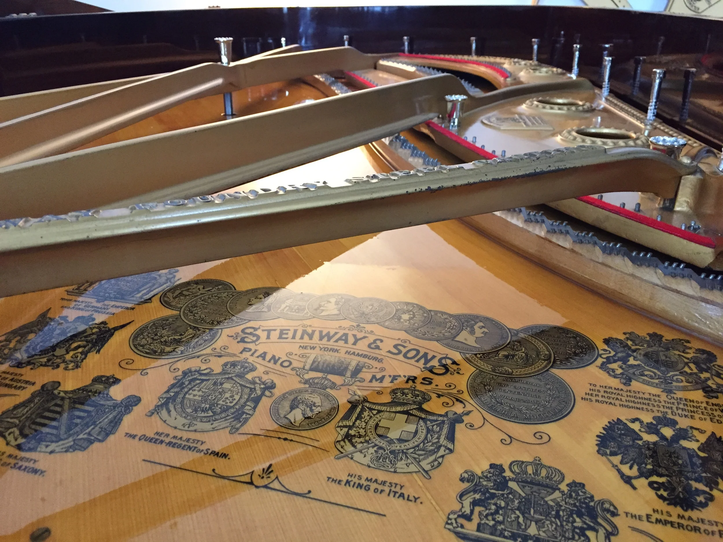 We were commissioned to restore this vintage 1904 Steinway model C grand but to keep as much original as possible, so the piano underwent a sympathetic restoration. The casework was cleaned and revived instead of re-polished and so too the plate (cast frame). It was fitted with a new action and had a full internal rebuild including extensive soundboard repairs.