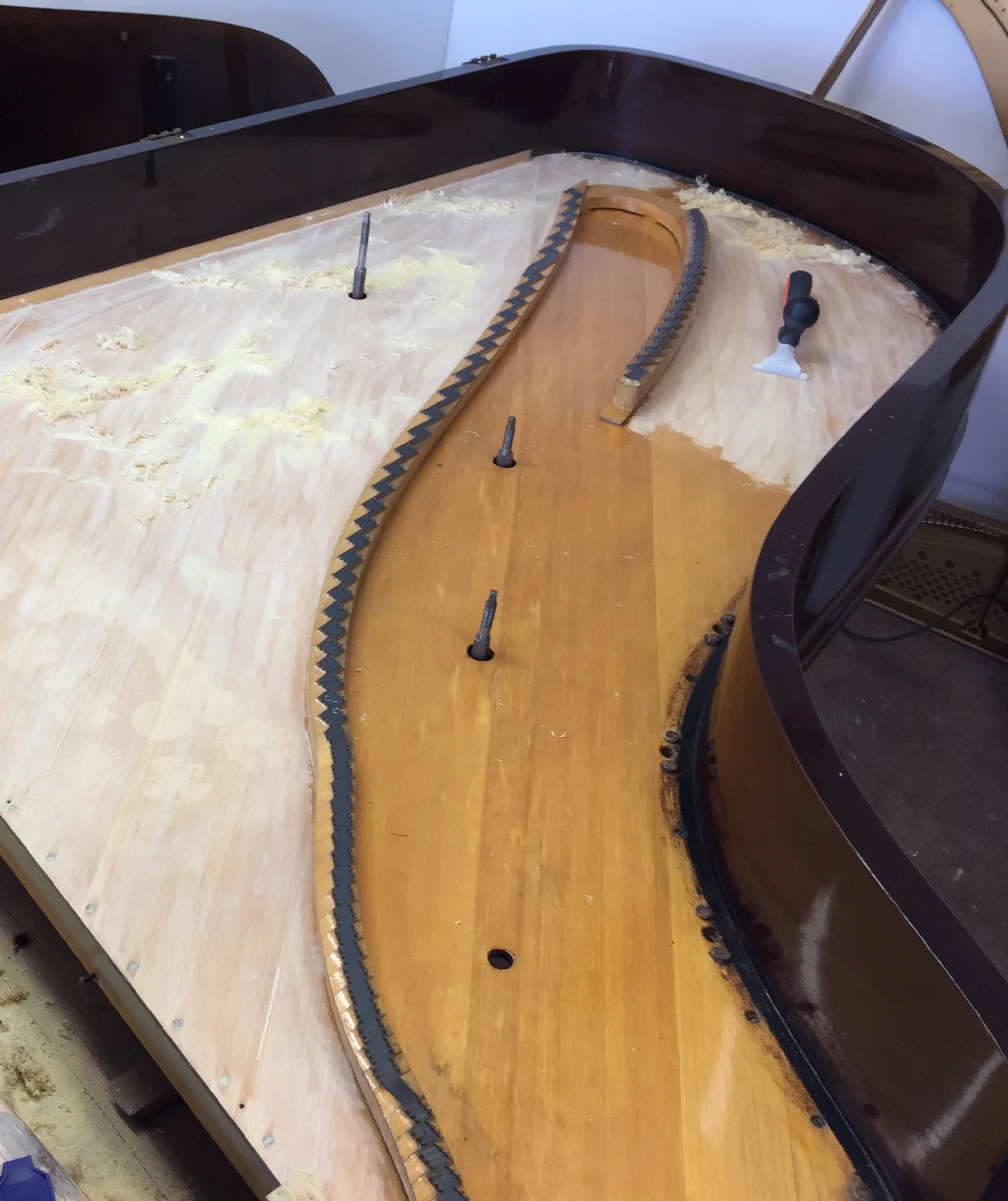 Soundboard varnish being removed after extensive repairs to the board. The original soundboard was kept on this piano to preserve the sound that the client wanted.